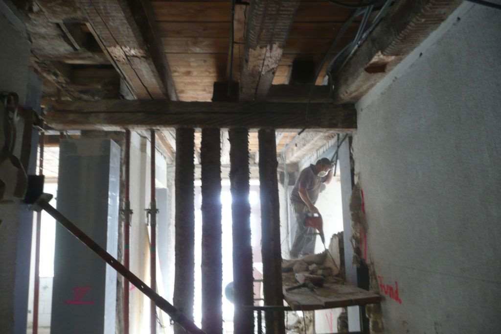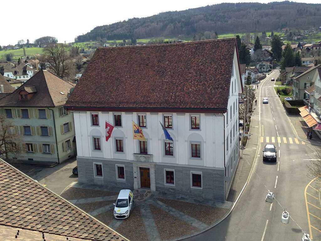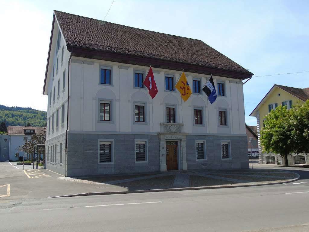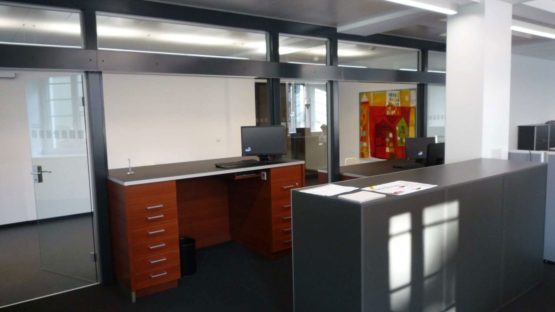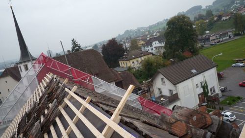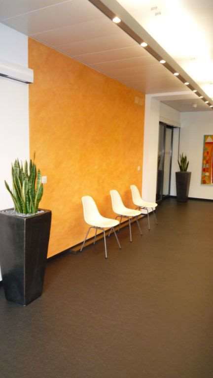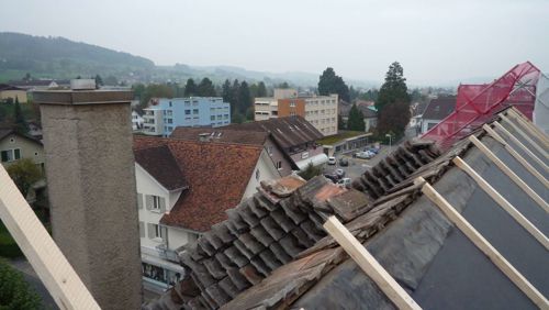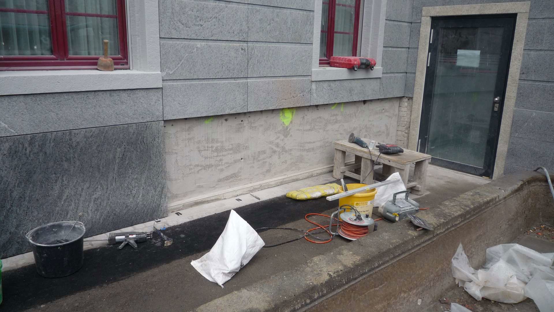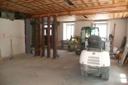 Fassaden- und Dachsanierung, Sockel in Naturstein. Verlegen Eingangsbereich und Neugestalltung der Verwaltung im EG (unter Mitthilfe von Innenarchitekt B. Dössegger, Seon)