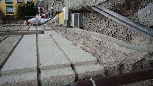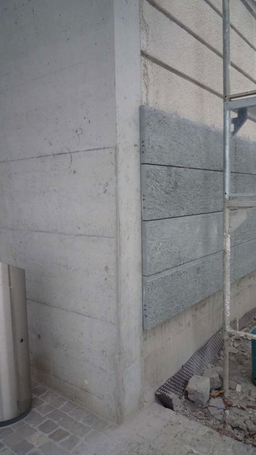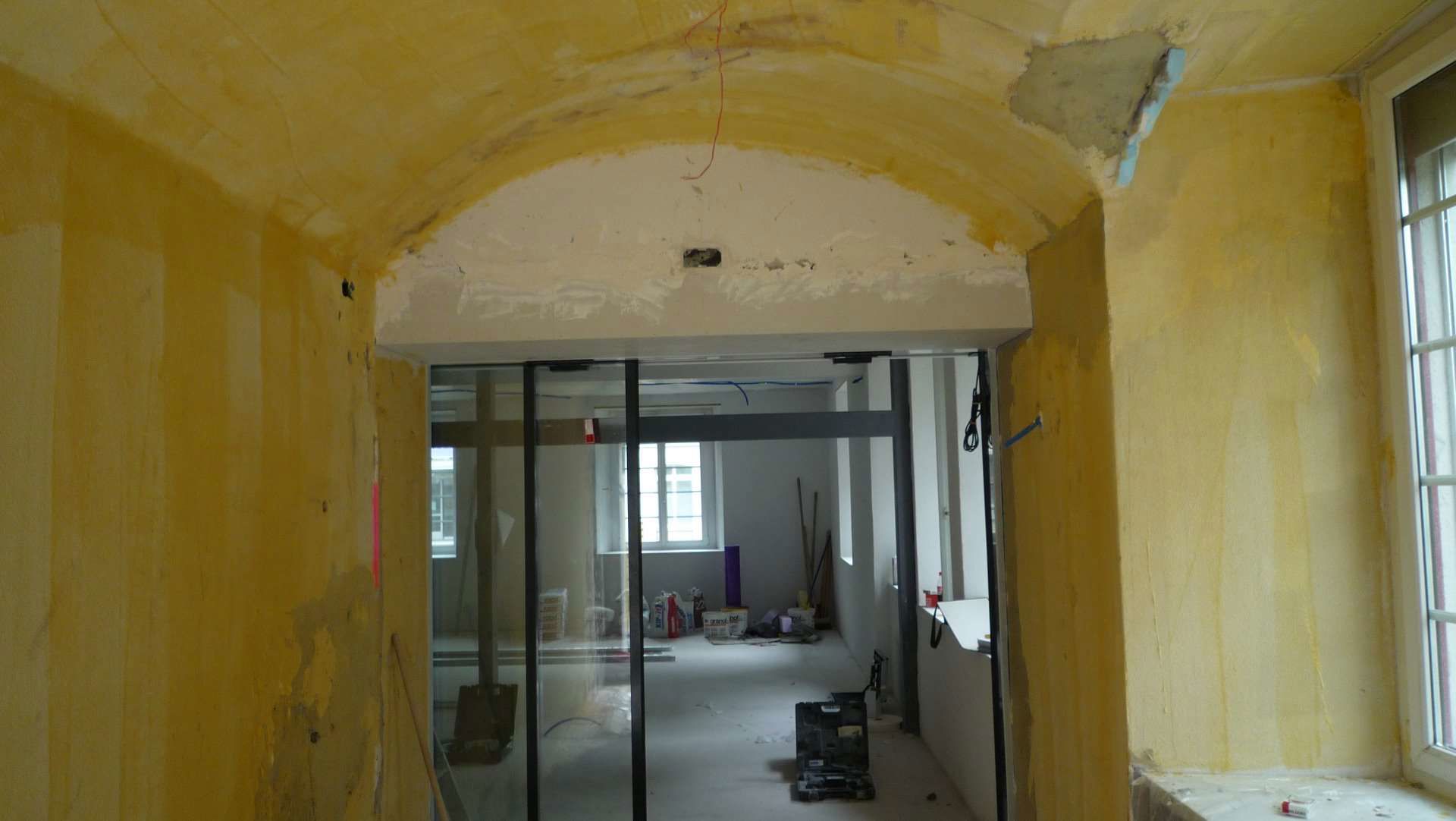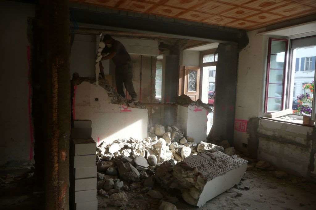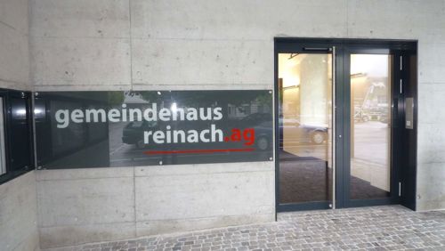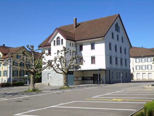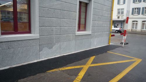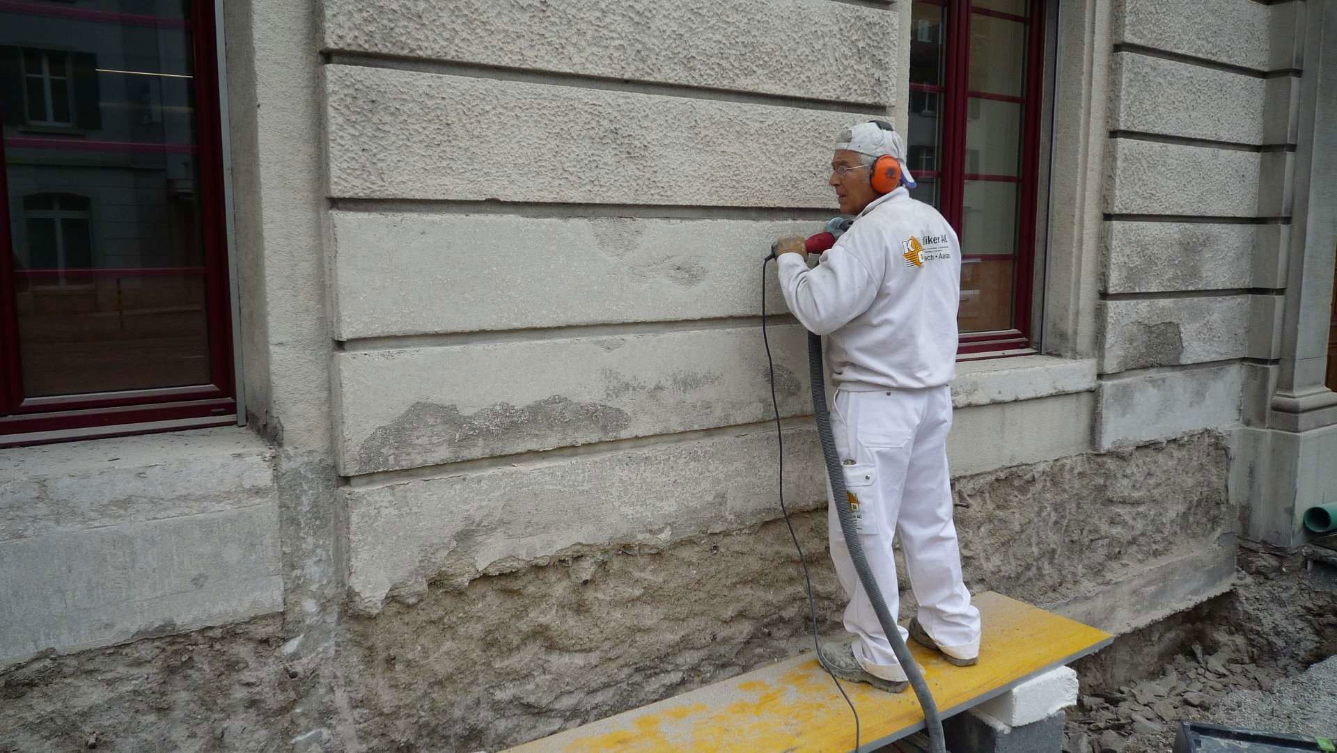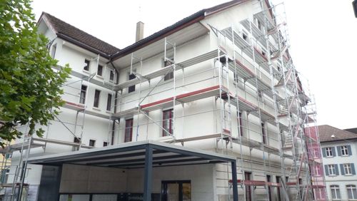 Fassaden- und Dachsanierung, Sockel in Naturstein. Verlegen Eingangsbereich und Neugestalltung der Verwaltung im EG (unter Mitthilfe von Innenarchitekt B. Dössegger, Seon)